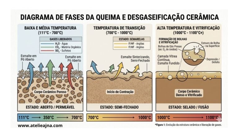 Nesta fase, ainda estamos eliminando águas de cristalização e os primeiros grupos hidroxila (-OH). Se você usa argilas com mica ou talco, saiba que elas ainda estão liberando gases até os 800°C. Se a subida for rápida demais aqui, a pressão interna pode fragilizar a estrutura.